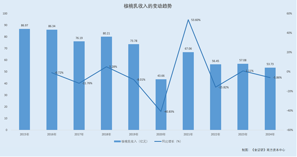 2015-2024年,养元饮品的核桃乳发卖收入别离为86。97亿元、86。34亿元、76。19亿元、80。21亿元、73。78亿元、43。66亿元、67。06亿元、56。45亿元、57。08亿元、53。73亿元,占同期停业收入的比例别离为95。39%、97。01%、98。43%、98。48%、98。91%、98。62%、97。11%、95。31%、92。63%、