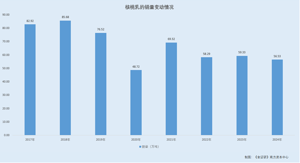 也就是说,2015-2024年,养元饮品的停业收入次要来自其次要产物核桃乳。而2024年,养元饮品的核桃乳发卖收入相较于2015年缩水了38。21%,销量较2018年缩水34。02%。值得留意的是,正在上市申报时,养元饮品暗示,养元饮品的产物品种较为单一,是养元饮品环绕打制大单品而设置装备摆设公司资本计谋实施的成果。将来,大单品计谋还将继续引领养元饮品的持续成长。但中持久看,养元饮品面对产物单一的风险,跟着大单品核桃乳市场拥有率不竭提高,可拓展的市场空间将相对缩小,会对养元饮品发卖收入的持续快速增加构成必然限制。
