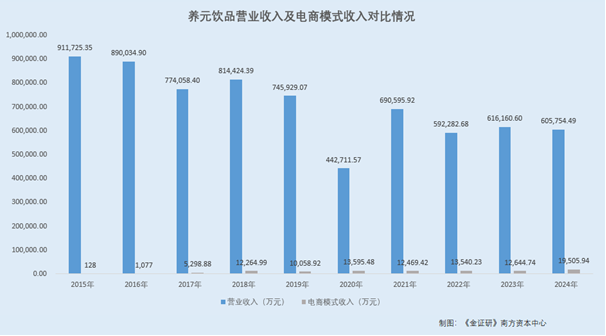 据签订于2018年1月29日的招股书,养元饮品从停业务是次要以核桃仁为原料的动物卵白饮料的研发、出产和发卖。此中,养元饮品的次要产物为动物卵白饮料核桃乳。除核桃乳外,养元饮品的产物布局中还包罗动物卵白饮料核桃花生露、核桃杏仁露、果仁露、杏仁露,以及复合卵白饮料核桃奶等。彼时按产物形成划分,养元饮品的从停业务收入形成分为核桃乳、核桃花生露、果仁露、核桃杏仁露、其他产物。此中,其他产物包罗杏仁露及核桃奶。2014-2016年,核桃花生露、果仁露、核桃杏仁露、其他产物合计的发卖收入别离为4。21亿元、4。19亿元、2。64亿元,占同期从停业务收入的比例别离为5。1%、4。59%、2。97%。而养元饮品于2018年上市。据养元饮品披露的各年度演讲,2017年,养元饮品将从停业务收入划分为核桃乳、其他动物卵白饮料,此中,其他动物卵白饮料的发卖收入为11,996。46万元,占从停业务收入比例为1。55%。2018-2019年,养元饮品将从停业务收入划分为核桃乳、其他动物卵白饮料、其他饮料。同期,其他动物卵白饮料发卖收入别离为10,382。64万元、7,261。14万元,占从停业务收入比例别离为1。28%、0。97%;其他饮料的发卖收入别离为1,723。47万元、559。72万元,占从停业务收入比例别离为0。21%、0。08%。此中,其他动物卵白饮料次要是指养元饮品出产的核桃花生露和核桃杏仁露等动物卵白饮料。正在2018年年度演讲中,其他饮料是指养元红枸杞型饮料。需要指出的是,2018年,为健康、摄生的消费需求,养元饮品推出跨品类新品养元红枸杞饮品。2019年,为满脚消费者多元化的需求不竭丰硕产物矩阵,养元饮品推出核桃咖啡乳和核桃发酵乳等新品类产物。据2020年年度演讲,养元饮品2019年年度财政演讲中披露的其他动物饮料包罗动物奶系列、脑洞大开核桃咖啡乳、养元红枸杞饮料、坚果核桃果仁露。2020年,养元饮品从头划分了其他动物饮料的类别,其他动物饮料指动物奶系列,将坚果核桃果仁露、脑洞大开核桃咖啡乳计入核桃乳系列。别的,养元饮品的从停业务收入中,新增了“功能性饮料”。2024年年度演讲显示,功能性饮料的次要代表品牌为“红牛维生素牛磺酸饮料”,其他动物饮料的次要代表品牌为“养元动物奶”。而动物奶方面,正在2019年年度演讲中,养元饮品暗示,2020年,将启动养元动物奶产物计谋,推出“大豆+核桃”动物奶产物,启用“养元young”动物奶品牌,对“养元”品牌进行优化,提高品牌的年轻活气力质,加强取年轻人的沟通。别的,正在2020年年度演讲中,养元饮品暗示,2021年,养元饮品将全力推出第二大计谋单品“每日养元动物奶”,持续加码动物基市场结构。简言之,2018-2019年,养元饮品先后推出养元红枸杞型饮料、核桃咖啡乳、动物酸奶等新品类产物。此中2018年,养元红枸杞型饮料发卖收入或逾1,700万元,而到了2019年,养元红枸杞型饮料和六个核桃动物酸奶的发卖收入合计不脚600万元。2020年,养元饮品对从停业务收入形成从头划分,不再提及养元红枸杞型饮料、核桃咖啡乳、动物酸奶(发酵乳)等产物。同时,养元饮品颁布发表推出第二大计谋单品“每日养元动物奶”,并零丁将动物奶系列划分为“其他动物饮料”。而2020-2024年,养元饮品的“其他动物饮料”收入合计仅1,159。2万元,此中2024年的收入则仅12。09万元。截至查询日2025年10月19日,养元饮品官网的披露的产物为六个核桃系列核桃乳、六个核桃2430系列核桃乳、以及养元动物奶。同时,由养元饮品认证的“六个核桃天猫旗舰店”的正在售产物均未包罗标示“咖啡”、“枸杞”、“酸奶”、“发酵乳”等字眼的相关产物。综上,2015-2024年,养元饮品的停业收入次要来自核桃乳,除了2024年贡献的收入占比不脚九成,其余演讲期均贡献超九成收入。2015-2016年及2018年,养元饮品的核桃乳发卖收入规模均曾超80亿元。截至2024年,养元饮品的核桃乳发卖收入仅53。73亿元,相较于2015年发卖收入缩水38。21%。另一面,2018年上市以来,养元饮品先后推出养元红枸杞型饮料、核桃咖啡乳、动物酸奶、每日养元动物奶等新品类产物,而前述多款新产物收入或尚未构成规模,而养元饮品的停业收入或“依赖”其大单品核桃乳。2015-2024年,国内互联网普及率由50。3%提拔至78。6%。跟着互联网的普及和电商的高速成长,保守零售业面对着史无前例的挑和。而养元饮品次要产物为核桃乳等动物卵白饮料,截至2024年收入仍次要来自经销渠道。而近十年间,养元饮品的经销收入相较高峰已缩水超三成,且其上市时披露的优良经销商过对折已登记或吊销。经销渠道增加或“乏力”背后,养元饮品正在2015年起头结构新兴电商渠道。而截至2024年,养元饮品电商收入仅1。95亿元,营收占比仅3。22%。据签订于2018年1月29日的招股书,养元饮品次要出产、发卖核桃乳等动物卵白饮料,而核桃乳饮料做为公共快速消费品,次要通过经销渠道抵达最终消费者。养元饮品的发卖模式包罗经销和曲销,此中曲销包罗通过电商渠道(电商代销、即从2014年到2024年,养元饮品的停业收入超九成来自经销模式。而正在此期间,养元饮品的经销模式收入正在2015年冲破90亿元触顶后,起头呈现下滑。截至2024年,养元饮品的经销模式收入仅57。29亿元,相较于2015年削减了36。74%。可见,2015-2024年,养元饮品的经销商数量逐年增加,但经测算的养元饮品对经销商的平均发卖收入